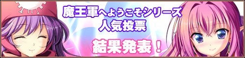 さて、これにて今回の魔王軍シリーズ人気投票は終了です。 予選から合せると2ヶ月、多くのご投票を頂き本当にありがとうございました。 そしてなにより、このように作品を横断しての人気投票を実施できたのも、 シリーズ作品を継続して遊んで下さっている皆様のおかげです。 これからもののの通信は心にビビッとくるようなゲーム制作を頑張ってまいります。 新作は魔王軍シリーズではありませんが、HPを来月に公開予定です。 皆様、今後ともどうかよろしくお願いいたします。 それでは、このあたりで魔王軍シリーズ改め、『第一回(?)ののの通信作品横断人気投票』を終了します。 最後までのお付き合い、ありがとうございます。 |